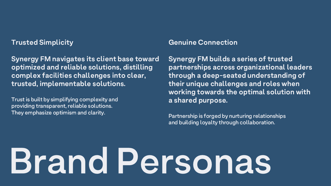 For Synergy FM, a boutique facilities management advisory firm, I led the creation of a cohesive brand system designed to establish credibility and create strong market awareness for this agile, expertise-driven firm. With over 35 years of experience behind it, Synergy FM needed a brand presence that reflected both its depth of knowledge and its boutique, tailored approach. I partnered closely with a colleague to develop the brand personas that drove this process, ensuring the visual identity aligned with the value proposition, tone of voice, and foundational messaging. This collaboration informed every design decision, ensuring the brand identity authentically represented Synergy FM’s core values and mission.